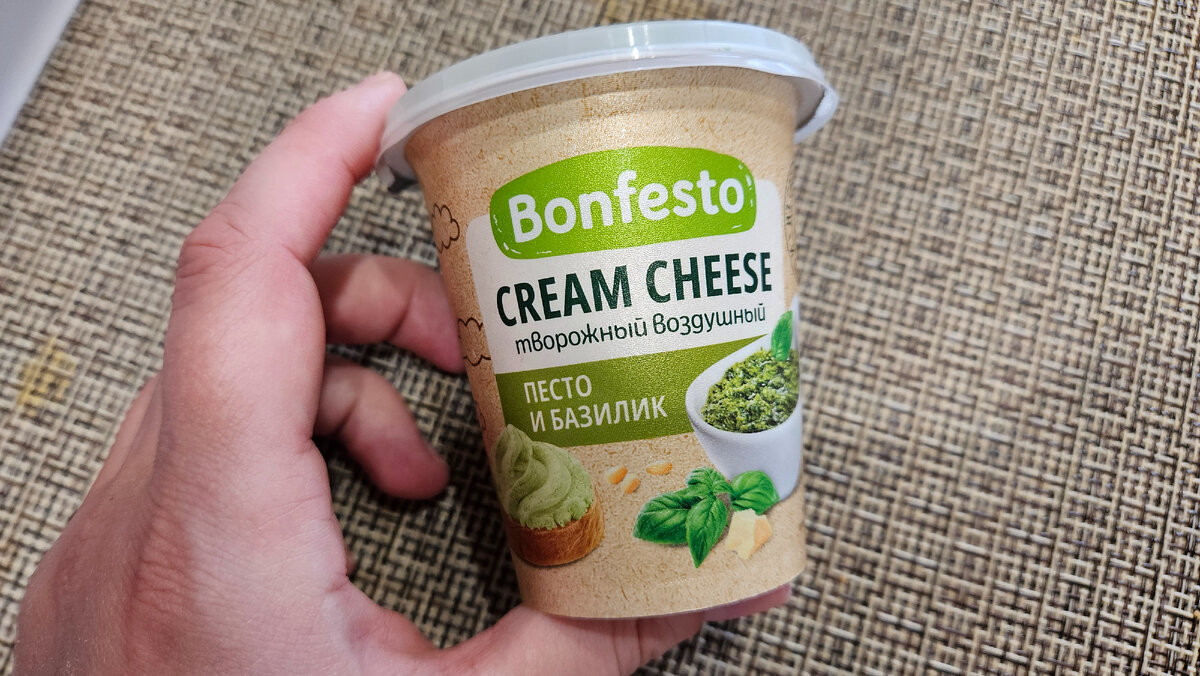 Люблю всякие намазки на завтрак, мажу их на тосты. Конкурентов у меня дома нет, поэтому мне достается всё одной😃. Обычно беру одни и те же марки и вкусы, но в этот раз решила попробовать что-то новое. Выбор пал на Bonfesto, он заманчиво выделялся на полке последней баночкой среди всех остальных. Думаю, раз раскупили, значит вкусный! Плюсом был его вкус. Только у этой торговой марки был Песто. Беру! Душа просит праздника и удовлетворения потребностей вексовых сосочков. Удобная компактная баночка, занимает мало места в холодильнике. Упакован как и все - одинаково. Пластиковая крышка и фольга под ней. На баночке много разной информации. Производитель Туровский МК (Беларусь, Гомельская обл., г. Туров). Массовая доля жира 65%. Углеводов в нем совсем нет, зато достаточно белка и жиров. Состав: Молоко пастеризованное, сливки пастеризованные, наполнитель "Песто и базилик" (вода, сахар, соль, загуститель - дикрахмалфосфат оксипропилированный, краситель натуральный, хлорофиллин, базилик сушеный