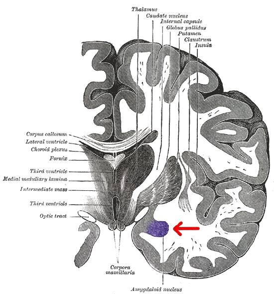 Миндалина эта область мозга ответственная за: страх, тревогу, агрессию. У пациентов с такими состояниями, как птср и панические атаки, это область может быть даже увеличена в размерах. И этим реакциям миндалевидное тело обучается. И принимает участие в формировании вообще всего обучения. В частности обучения страхом. Есть данные, что при повышенном уровне гормона стресса, у крыс быстрее и лучше идет обучение. В социальном поведении это выражается как недоверие и бдительность. Для второй части этого интересного пазла нужно указать, что миндалевидное тело находится в лимбическом слое, и это никакая не кора и не область осознанной нервной деятельности, которую мы привыкли обсуждать (см. Картинку) Итак, эта область может получать стимулы извне, минуя логические области. И реагировать страхом, еще до того, как мы имели бы возможность хоть что то осмыслить. И научается это делать в течение жизни. А вот научиться не бояться мы можем, только затормаживая процессы в миндалине извне-