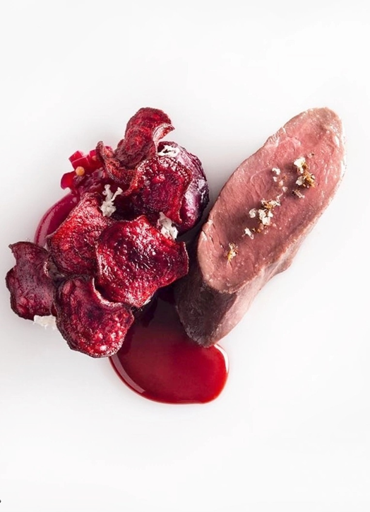 Идеальное сочетание оленины со сложным гарниром: пюре из карамелизированного лука со свеклой, копченой мини-свеклой конфи, политым свекольно-луковым релишем (соусом), украшенным свекольными чипсами, свекольным жу с кофе, а также небольшим количеством тертого свежего хрена и можжевеловой солью для вкусового акцента.