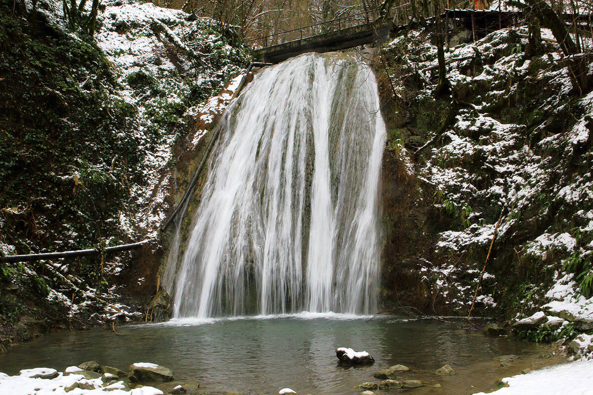 На 9-е марта была запланирована экскурсия в ущелье 33-х водопадов. Правда, погоду обещали не весьма благополучную, скорее весьма не.. Но планы есть планы и экскурсию мы купили. Утро в Адлере совсем не напоминало о прогнозах синоптиков. Все самое интересное началось, когда мы стали подъезжать центральной части Сочи. Небо стало гораздо темнее, а с неба полился дождь, а местами начал сыпаться снег. Все это воодушевляло (на подвиги). Кстати, по дороге в автобус подсел экскурсовод, который сразу и честно сообщил, что зовут его Армен. Поэтому он просит не называть его иными именами, а то туристы его постоянно именуют ... далее последовал подробный перечень имен по алфавиту, закончившийся Эдуардом. Хотя, зря я так думал. Он замкнул цикл и перешел к Абдуле. Правда по второму кругу он не пошел. А начал рассказ о маршруте. Правда, информации о самом маршруте было немного, но его талант - используя с десяток слов составить 15 разных предложений, не имеющих никакой информации потряса