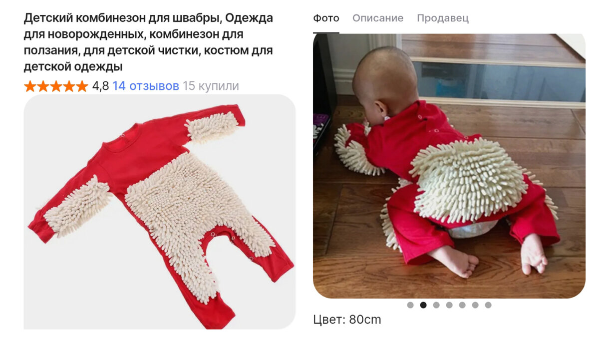 "Подходит для тех, кому это нужно" - из описания одного из оригинально-странного товара. Порой в магазинах видишь товар и думаешь - неужели кто-то это покупает? Например, видишь сшитую вещь и задаëшься вопросом - а зачем? Предлагаю подборку вещей с Али. Удивили меня, не могла не поделиться с вами. Некоторые из них точно заставят улыбнуться или крутануть пальцем у виска. 12. "Я у мамы вместо швабры" Гениальное китайское изобретение, позволяет сэкономить время мамы на помывку полов. Ребëнок ползает, пол моется. Все счастливы. 11. Салфетки, откуда надо Сомневаюсь, что сам себе кто-то купит. Но добрые друзья ради прикола вполне могут подарить. 10. Кружевная накидка на унитаз Сначала хочется покрутить у виска, когда узнаешь о существовании таких вещей. А потом приходишь в недоумение, ведь реально есть люди, которые ещë и покупают такой "креатив". А как же практичность? Конечно, 59 покупателей - не слишком много, но тем не менее они есть! Да ещë и отзывы положительные имеются. Ну вот к