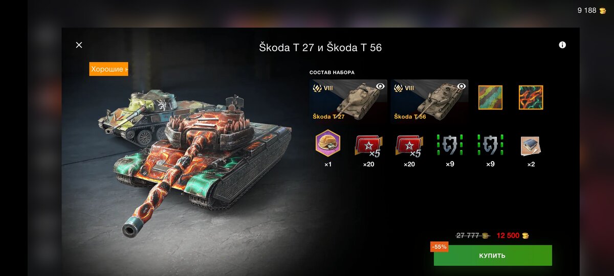 Здравствуйте, уважаемые читатели и подписчики канала! В игровой магазин Tanks Blitz завезли в продажу Skoda T27 и Skoda T56, давайте без лишних слов посмотрим, что это за танки и стоит ли их вообще покупать. Skoda T27 это барабанный средний танк, без дозарядки, барабан на 3 снаряда со средним уроном в 220 единиц, и около 2000 урона в минуту, пробиваемость на базовом снаряде 194 мм. Перезарядка барабана занимает чуть меньше 17 секунд. Особенностью барабана является быстрая перезарядка между выстрелами, всего 1.5 секунды. Угол наклона орудия вниз -8 градусов, чуть вылезти из укрытия для хорошего выстрела иногда придется. Хорошее бронирование здесь по сути не предусмотрено, надежда только на рикошеты, башня ещё может что-то танковать, но только маской, с корпусом все проще, там одна серая зона. Подвижность на уровне других средних танков, максимальная скорость около 50-60 км/ч. Часто Skoda сравнивают с другим известным барабанщиком Progetto 46, так вот итальянец в этом сравнении