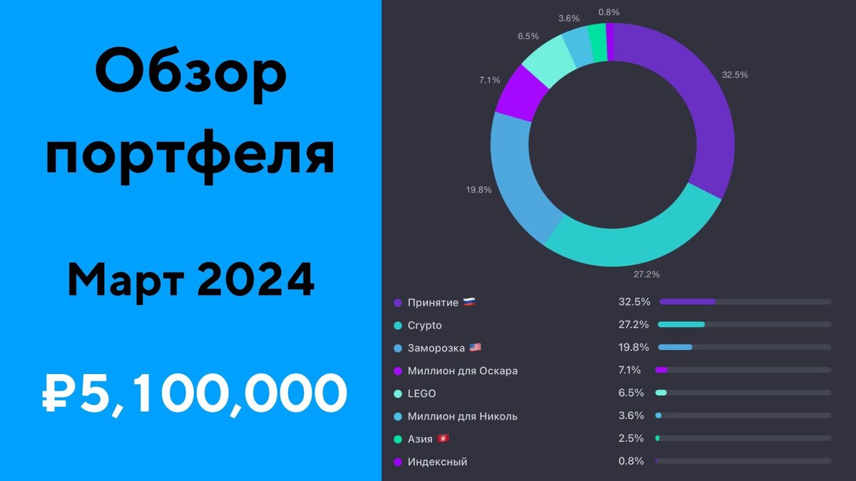 📈 Совокупный портфель второй месяц подряд прирастает на ₽500 тысяч. В марте из этой суммы 300 пришлись на крипту, 150 — на российские бумаги, 60 — на пополнения. Только LEGO-портфель похудел на 10 тыс.