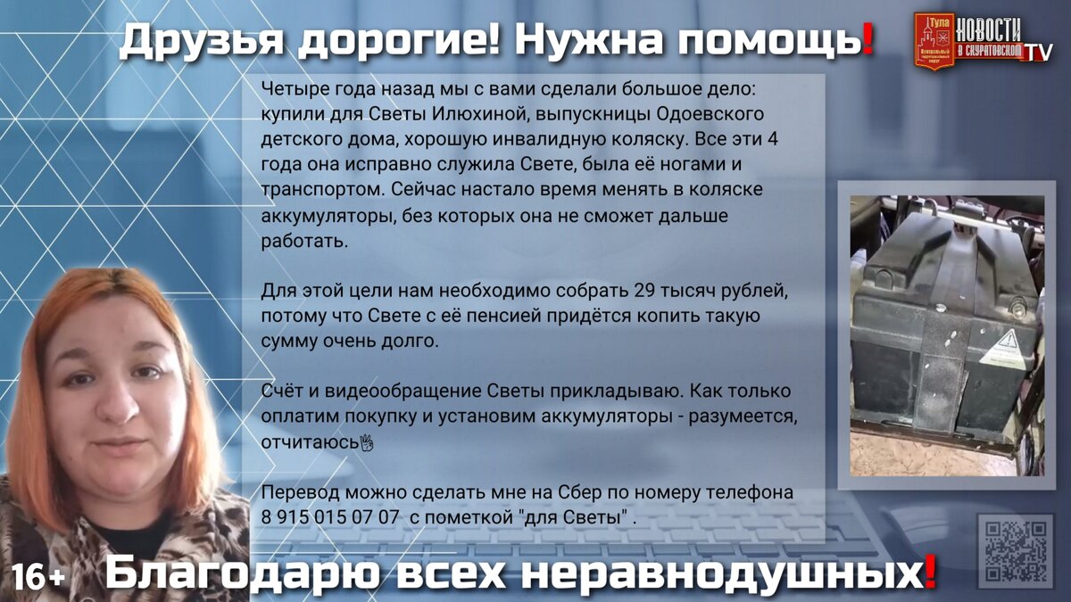Четыре года назад мы с вами сделали большое дело: купили для Светы Илюхиной, выпускницы Одоевского детского дома, хорошую инвалидную коляску. Все эти 4 года она исправно служила Свете, была её ногами и транспортом. Сейчас настало время менять в коляске аккумуляторы, без которых она не сможет дальше работать.
