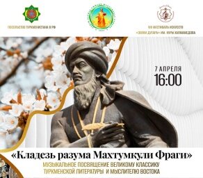 В программу включены шедевры мировой, российской и туркменской классики и моноопера «Монологи Махтумкули Фраги» композитора Мамеда Гусейнова. При поддержке Посольства Туркменистана в Российской Федерации в Музейно-выставочном комплексе Российской Академии Художеств продйет очередное творческое мероприятие, посвящённое 300-летию со дня рождения Махтумкули Фраги. Концерт-посвящение «Кладезь разума Махтумкули Фраги» состоится 7 апреля в 16.00 часов. Организационный комитет VIII Московского международного фестиваля искусств «Звуки дутара» им. Нуры Халмамедова привлек к участию в концерте деятелей культуры и искусства Российской Федерации и Туркменистана. В программу включены шедевры мировой, российской и туркменской классики — произведения Н.А. Римского-Корсакова, Э. ди Капуа, М. Равеля, Д. Овезова, А. Пахмутовой, Н. Халмамедова, Ч. Нурымова, К. Волкова, М. Гусейнова. Прозвучат вокальные сочинения на стихи Махтумкули, Молланепеса, Хаджи Какалиева, Ата Атаджанова, Николая Добронравова, Джов