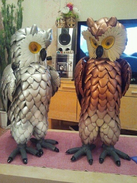 Взяв за основу отслуживший материал, можно создать множество шедевров, которые особенно актуальны в ландшафтном дизайне участка. Обычно поделки размещают на земле, сова из пластиковых бутылок, удобно расположившаяся среди ветвей сада, удивит окружающих. Способов как сделать ночную птицу несколько, они отличаются по степени сложности.
