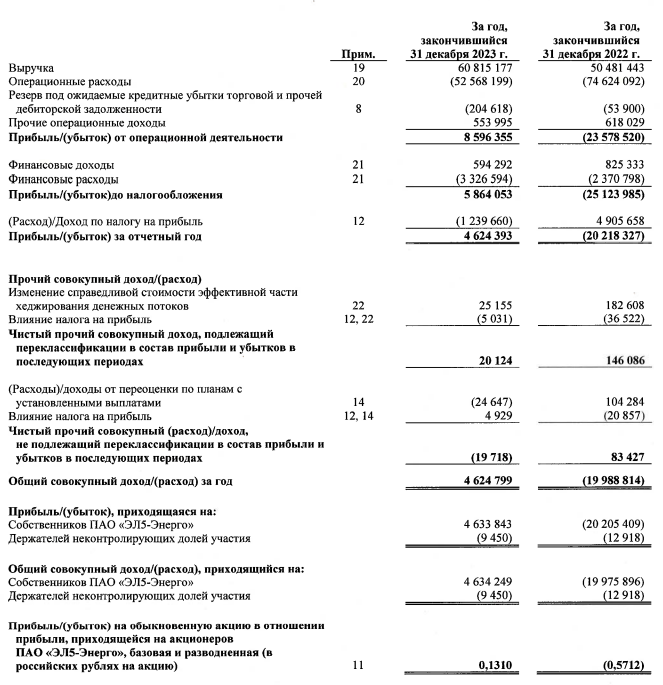 🔌 ЭЛ5-Энерго опубликовала финансовые результаты по МСФО за 2023 г. Компания оказалась в крутом пике в 2022 г. (проблемы начались с продажи компании итальянцами, потом добавилось обесценивание активов в размере 29,5₽ млрд, половина суммы пришлась на введённые в строй ветропарки), но за 2023 г. проделано очень много работы, новый менеджмент достойно вышел из ситуации (компания генерирует ЧП, развивает инвестдеятельность и начала сокращать долг уже в 2023 г.). Такие изменения во многом связаны с тем, что главным мажоритарием компании стал ЛУКОЙЛ (консолидировал 56,44% акций в декабре 2022 г.), который в декабре 2023 г. получил разрешение на приобретение принадлежащих UROC Limited 2,6 млрд акций и в январе 2024 г. на сайте ЭЛ5-Энерго уже было видно, как ЛУКОЙЛ увеличил свою долю до 63,84%. Перейдём же к основным показателям компании: ⚡️ Выручка: 60,8₽ млрд (+20,5% г/г) ⚡️ Чистая прибыль: 4,6₽ млрд (годом ранее убыток — 20,2₽ млрд) ⚡️ EBITDA: 12,1₽ млрд (+29,4% г/г) 💡 Если рассматривать о