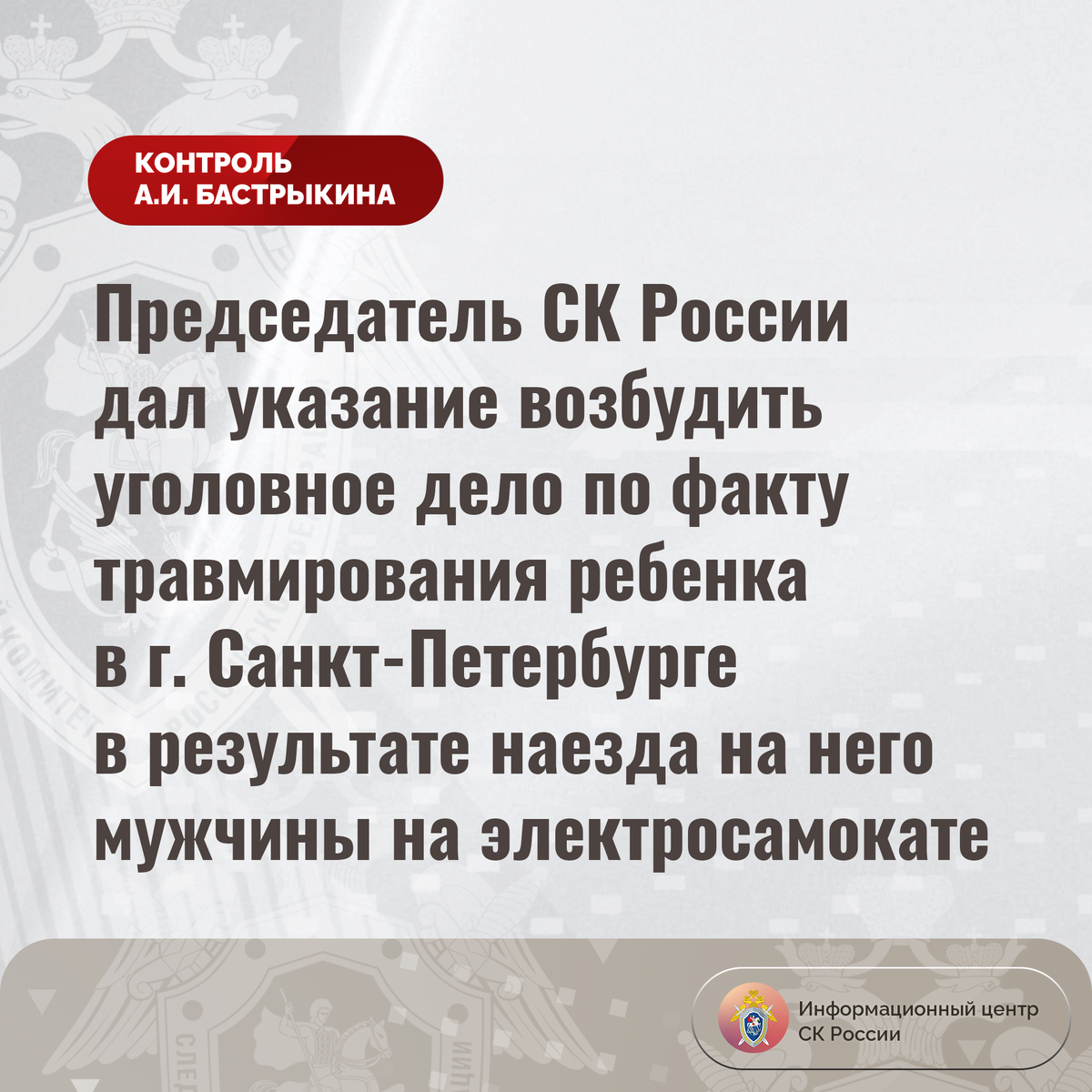 Председатель СК России дал указание возбудить уголовное дело по факту травмирования ребенка в г. Санкт-Петербурге в результате наезда на него мужчины на электросамокате