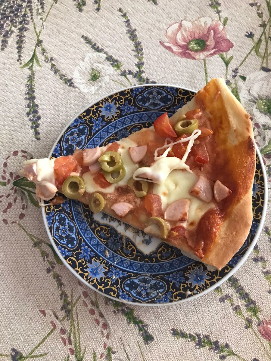 Ингредиенты на 2 пиццы размером 30 см.: Для теста: Мука - 300 г, Вода - 190 г, Масло подсолнечное - 2 ст. л. Дрожжи - 4 г, Сахар - 10 г, Соль - 5 г. Для начинки: Колбаса Докторская - 300 г, Сыр Моцарелла - 300 г, Помидоры - 2 шт, Оливки - 0,5 банки. В теплую воду добавить дрожжи, сахар и немного муки и оставить в теплом месте. Через 5-10 мин. вылить дрожжи в муку, добавить соль и подсолнечное масло. Замесить тесто сначала ложкой, потом руками. Замешивать 5-10 мин. Тесто будет чуть липнуть к рукам. Разделить на две части. Поставить в теплое место подниматься на 40-60 мин. Тесто увеличится в 2 раза. Берем шар теста, раскатываем скалкой или растягиваем руками, формируя бортики по краям. . Добавить часть сыра, тонко порезанные помидоры, колбасу, оливки, и снова сыр. Можно что-то другое по вкусу. Можно тесто смазать кетчупом. Выпекать в духовке 10 мин. при температуре 240 град. Дно пиццы должно лишь слегка подрумяниться. Приятного аппетита!