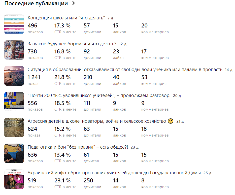 Здравствуйте, друзья! На данном канале материалы стали редки. Связано это с несколькими причинами. Во-первых, увеличилось количество работы, связанной с движением Алексея Савватеева "Родная школа". Могу рекомендовать телеграм-канал и ютуб: В общем, заходите сюда. Часть моих мыслей там присутствует потому что я, опять же, среди прочих, имею прямое отношение к содержанию каналов. Во-вторых, Дзен что-то там накрутил. То ли у всех, то ли у меня. После чего количество посетителей канала резко упало. А регулярная работа по исправлению кое-как подняла ситуацию только до этого: Раньше было так: Тут выделена колонка показов. И, конечно, 782 тысячи показов было только один раз. Но до этого их количество прыгало от двух-трех тысяч до 50-60 на максимуме. С этим было связано и количество прочтений, конечно, и количество подписчиков. И хотя я всегда говорю, что ценю не количество, а качество, но столкнулся с ситуацией, когда на канале осталось примерно 150-200 человек, заинтересованных в се