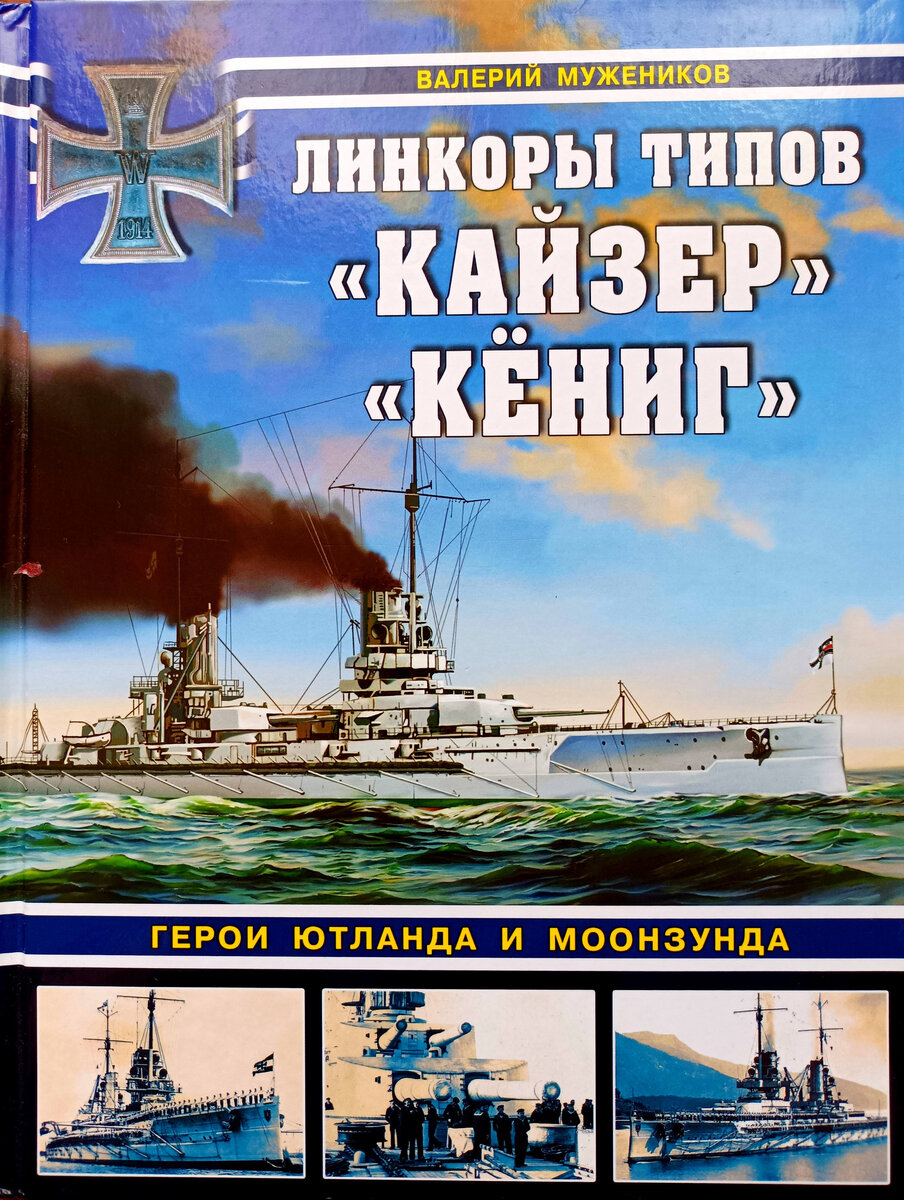 Книга имеет следующие выходные данные - Мужеников, В. "Линкоры типов "Кайзер" и "Кениг". Герои Ютланда и Моонзунда/ В.Б.Мужеников - Москва: Яуза-пресс, 2022. -136 с. Название интригует, но не особо - сразу ясно, какие корабли здесь рассматриваются и их боевой путь. Правда тут как бы можно подискутировать. Если с Ютландом вопросов не возникает - восемь из девяти построенных кораблей этих проектов приняли участие в этом сражении (отсутствовал "Кениг Альберт"), то с Моонзундом - вопрос спорный. Нет, никто не ставит под сомнение участие этих немецких дредноутов в Моонзундской операции 1917 года - участвовали, но называть эти корабли "героями" при подавляющем превосходстве немецкого флота над русскими силами Рижского залива, в составе которых было два броненосца-додредноута, о меньшей мере странно. Даже "Кайзер" - выключивший одним 305-мм снарядом русский эсминец "Гром" не тянет на героя. Спору нет, в ходе этой операции немецким дредноутам пришлось неоднократно садиться на мель, подрываться на минах, вступать в перестрелку с береговыми батареями, участвовать в дуэлях со "Славой" и "Гражданином" - 20-305-мм против 8-305-мм орудий. Так это обычная боевая работа линейного корабля. Впрочем не настаиваю, кому нравится - может согласиться и с таким названием, тем более выбора то нет.