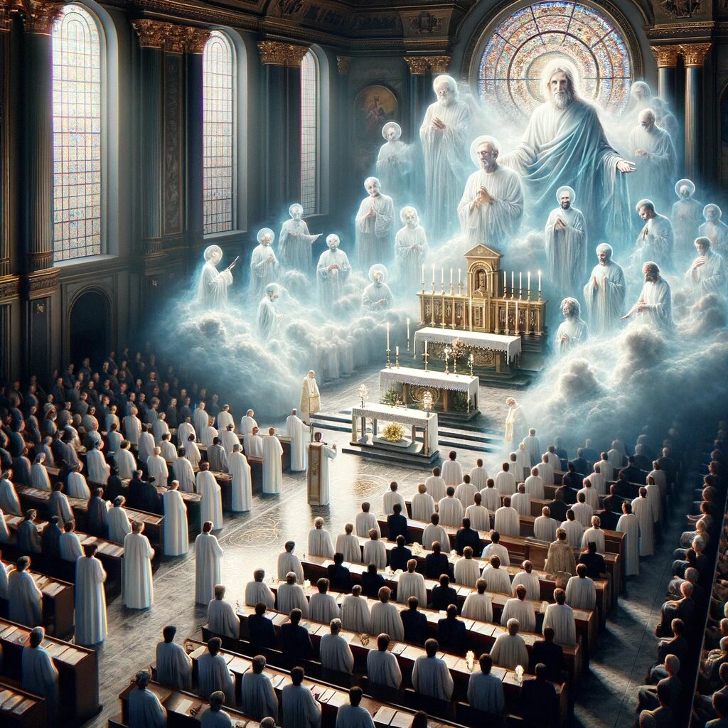Церковь и Литургия играют критически важную роль, напоминая нам о нашем коллективном путешествии в вере и о том, что мы никогда не бываем одиноки на этом пути. Это утверждение находит отражение в словах апостола Павла в Послании к Евреям, где он говорит о "великом облаке свидетелей", окружающих нас. Эти слова призваны напомнить нам о множестве верующих, прошедших путь веры до нас, чьи жизни служат нам примером и вдохновением. Когда мы собираемся вместе в храме для участия в Литургии, мы делаем это не только как отдельные индивиды, но как часть большего духовного сообщества, которое простирается за пределы времени и пространства. Мы соединяемся с верующими прошлого, настоящего и будущего, в едином стремлении к вечной цели в общении с Богом. Это осознание нашей связи друг с другом и с предшествующими нам поколениями верующих придает силу и уверенность в нашем духовном путешествии. Молитвы, песнопения и ритуалы Литургии служат не просто как форма поклонения, но как средство укрепления эт