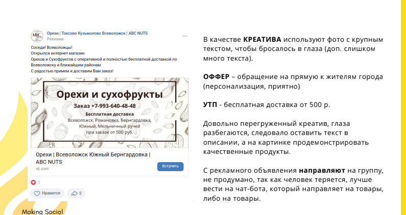 Клиент: Орешкофф. рф — купить орехи, сухофрукты в СПб Обратился с целью увеличения заказов с помощью таргетированной рекламы через VK рекламу. Задачи: Повышение узнаваемости и увеличение заказов через таргетированную рекламу. Посадочные страницы: Cообщество Вконтакте, сайт заказчика, где совершаются заказы. Первым делом мы провели анализ конкурентов. Что используют конкуренты: Выводы: - Главная цель конкурентов – продать свою услугу и сделать ее наиболее запоминающимся любыми способами (описать подробно, как решаются такие проблемы).