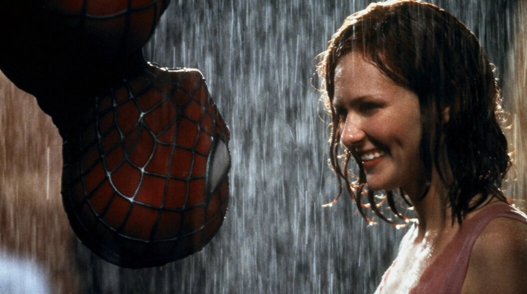 В фильме "Человек-паук" от Сэма Рэйми имеется культовая сцена с главным героем и Мери Джейн. В ней герой, повиснув на паутине верх ногами, целует Мэри Джейн. Сцена выглядит красиво и кажется достаточно простой для съёмки. Однако актёры фильмы говорят, что испытали настоящие сложности во время её съёмок. Несколько месяцев назад Тоби Магуайр уже вспоминал о съёмках этой сцены. И актёр рассказал, что его лицо заливало дождём, а Кирстен Данст закрыла ему рот маской, что привело к тому, что он не мог дышать.