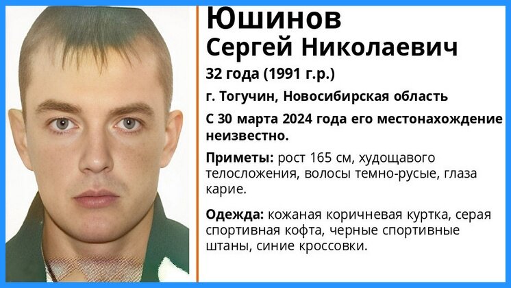 В городе Тогучине Новосибирской области без вести пропал 32-летний Сергей Юшинов. С 30 марта 2024 года его местонахождение неизвестно. Теперь мужчину ищут волонтеры поисково-спасательного отряда (ПСО) «ЛизаАлерт» и сотрудники полиции. Приметы пропавшего: рост 165 сантиметров, худощавое телосложение, волосы темно-русые, глаза карие. В день исчезновения был одет в кожаную куртку коричневого цвета, серую спортивную кофту, черные спортивные штаны и синие кроссовки. Если у вас есть информация о местонахождении Сергея Юшинова, сообщите об этом по телефону ПСО 8-800-700-54-52 или наберите 112. Ранее «Вести Новосибирск» рассказывали, что 35-летний Григорий Будько, пропавший после теракта в подмосковном «Крокусе», погиб. Его имя оказалось в списке жертв трагедии, опубликованном на сайте МЧС России накануне. За несколько минут до трагедии Григорий Будько скинул своей сестре фотографию из концертного зала Crocus City Hall.