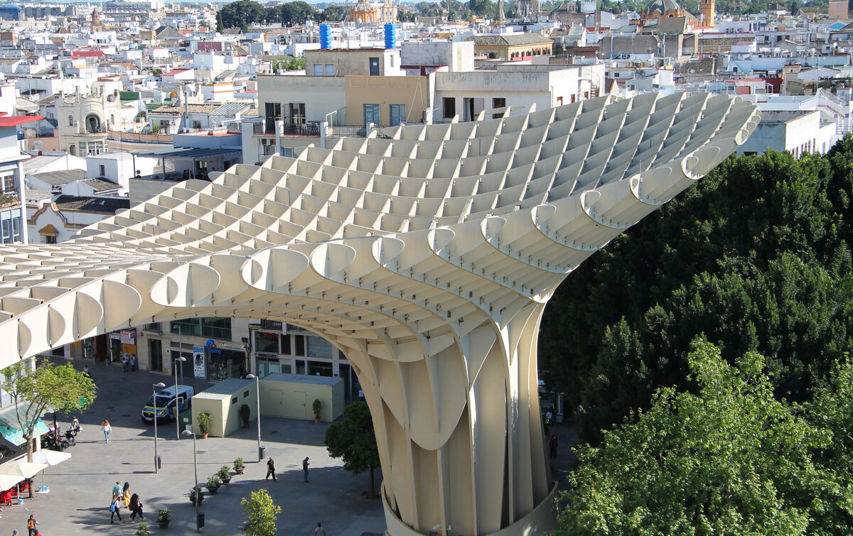 Увидев заголовок этой статьи, Вы уважаемый читатель, не ошиблись. Действительно в самом центре испанского города Севилья вырос огромный гриб. Этот гриб был возведён в апреле 2011 г. по проекту немецкого архитектора Юргена Майера и был назван Metropol Parasol ("городской зонтик" переводе с испанского): Теперь обо всём по порядку. Город Севилья является столицей Андалусии, географически самого ближнего к Африке (Марокко) региона Испании. Андалусия не самый богатый регион по уровню жизни населения в Испании, ведь основу экономики здесь составляет сельское хозяйство. Однако богатство этого региона заключено именно в культурном и историческом аспектах. В одной только Севилье есть и дворцовый комплекс, доставшийся в наследство от Мавров, и один из самых больших католических соборов в Европе, и аутентичная арена для корриды, а так же плотная сеть живописных узких улочек. Все вышеназванные достопримечательности имеют многолетнюю, а то и многовековую историю. Но есть в Севилье и объект современ