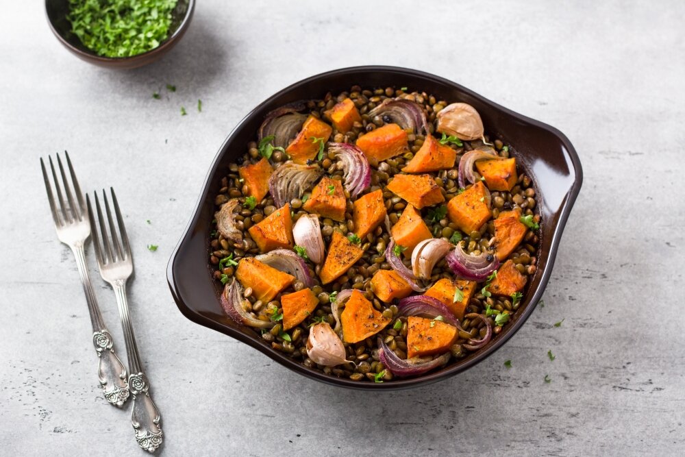 Секрет этого сытного блюда из чечевицы с тыквой и вкусным запечённым луком в том, что готовится оно исключительно в духовке, а всё что запекается в духовке получается гораздо вкуснее. В этом рецепте чечевица с овощами сначала томится в закрытом виде, а в финале - запекается, приобретая этот особенный вкус и аромат запечённых овощей. Ингредиенты: • Чечевица – 200 г • Тыква – 150 г • Лук красный – 1 шт. можно обычный • Чеснок – 4 зуб. или по вкусу • Масло растительное – 2 ст.л. • Перец черный – по вкусу • Лавровый лист – 2 шт. • Соль – по вкусу Приготовление: 1. Подготовить все ингредиенты по списку. Количество чечевицы и овощей условное. Можно добавить больше чечевицы или тыквы в зависимости от вашего вкуса. Кроме тыквы, лука и чеснока в это блюдо можно добавить другие овощи. Очень вкусно запекаются помидоры и сладкие перцы. Они, помимо дополнительного вкуса и аромата, делают блюдо сочнее. Красный лук по желанию можно заменить на обычный репчатый. Все овощи необходимо пом