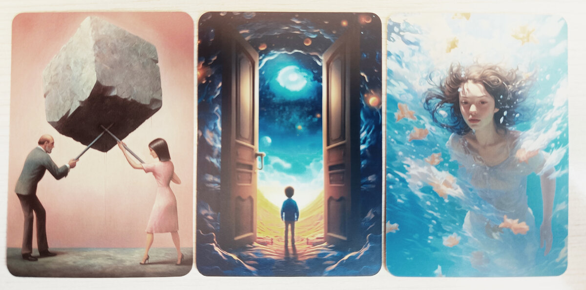 Взросление... История: на первой карте родители с их тяжёлыми программами, на второй - ребёнок, который находит выход из этих программ, но ещё не решается сделать шаг, на третьей - девушка уже полностью в своей стихии, в своей уникальности...