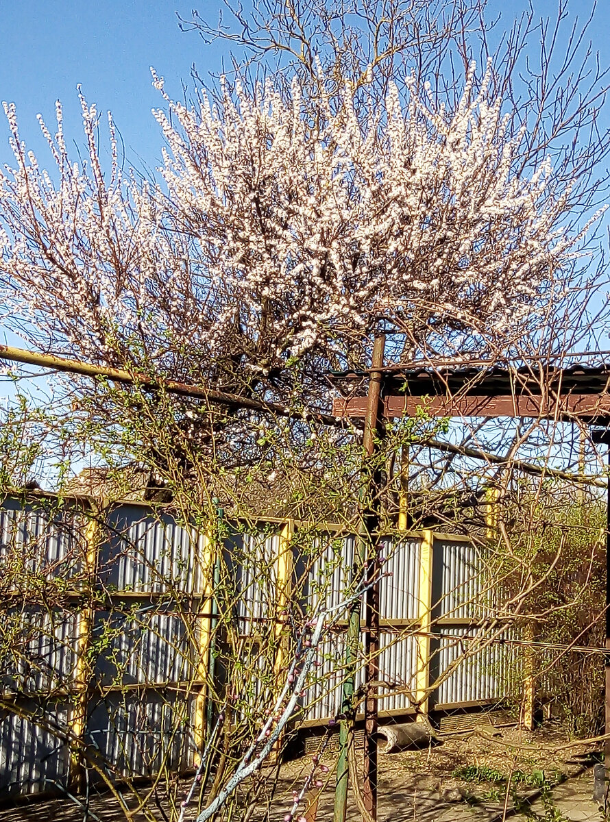 Абрикос в цвету . Второй абрикос растёт за двором.. После урагана, даже можно сказать смерч, который прошёл по посёлку 5 лет назад, даже сносил шиферные крыши и пострадал наш абрикос. Раскололся наполовину, одну часть залечили, долго не цвел и не было плодов. Сегодня он так цветет и надеюсь попробуем его вкусные, сладкие, крупные абрикосы как раньше. Если не будут, то распрощаемся осенью и спилим полностью. Следите за публикациями. До свидания.
