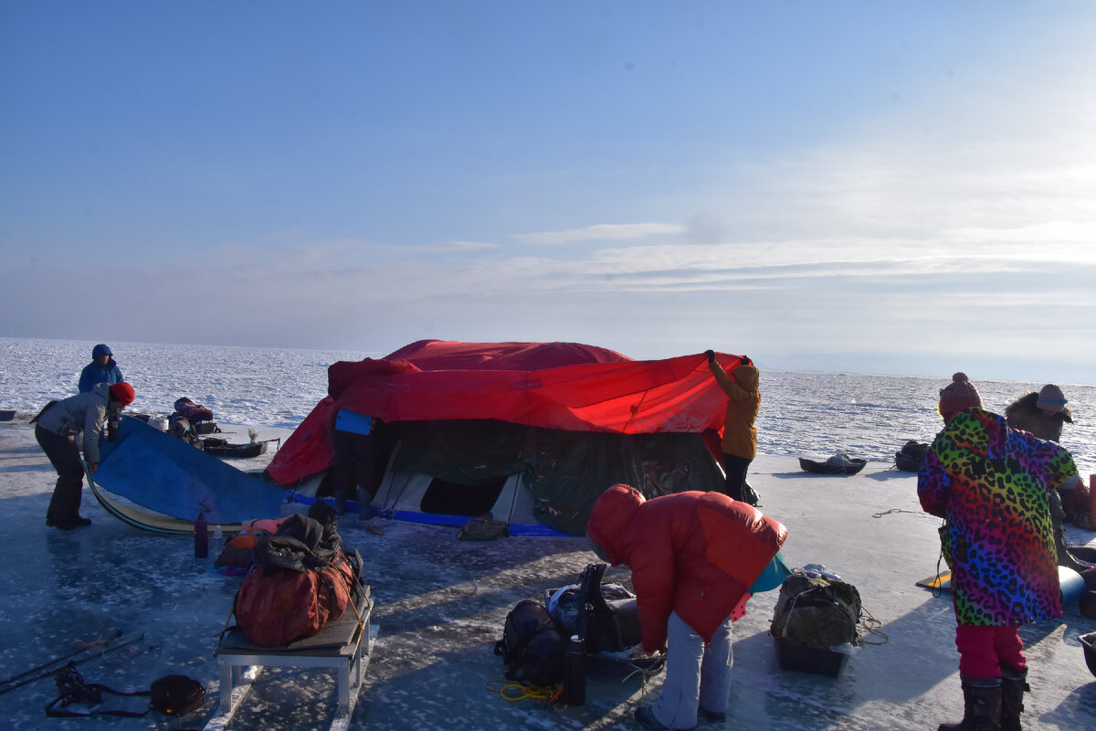 Ночевали посередине Байкала. А утром опять топаем дальше. Собираемся быстро каждый знает что делать и по этому собираемся быстро солнечно виднеется наша цель на сегодня. Один из Ушканьих островов торосы но попадается и гладкий , ровный лёд девушки надели коньки и покатались тут же и обед устроили идём торосы ночевали с комфортом