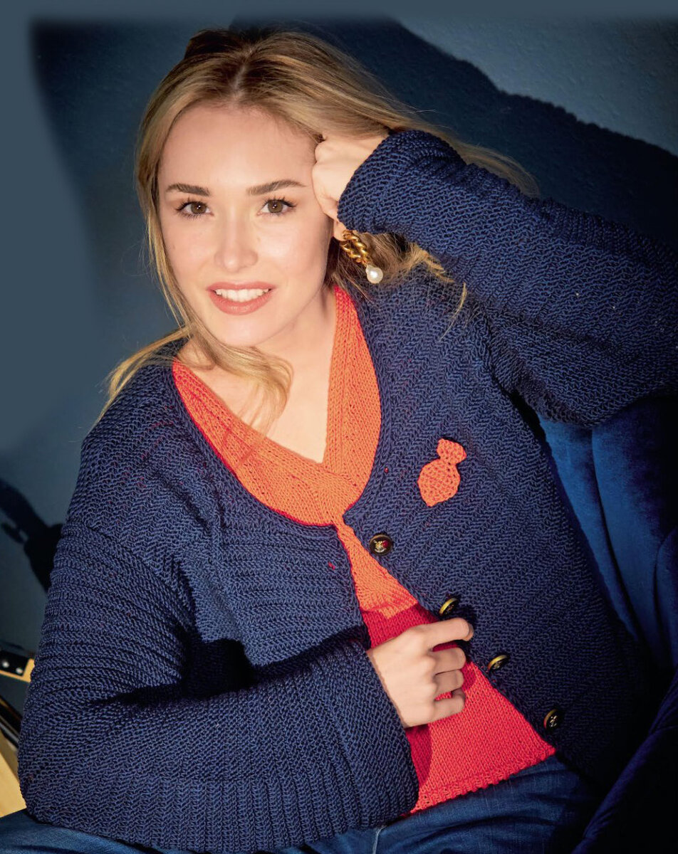 Вышитые спереди и на спинке морские узлы сразу определяют стиль этой модели. Им вторят тонкие красно-синие полоски на белом фоне и голубые рукава реглан, связанные плетеным узором.