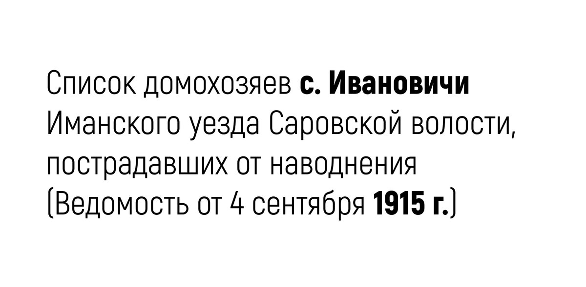 Ниже привожу список домохозяев села Ивановичи Иманского уезда Саровской волости, пострадавших от наводнения (из Ведомости экономического состояния селений 14-го крестьянского участка)