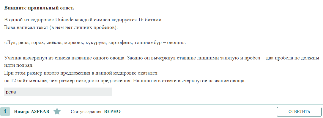 В одной из кодировок Unicode каждый символ кодируется 16 битами. Вова написал текст (в нём нет лишних пробелов): «Лук, репа, горох, свёкла, морковь, кукуруза, картофель, топинамбур –– овощи». Ученик вычеркнул из списка название одного овоща. Заодно он вычеркнул ставшие лишними запятую и пробел –– два пробела не должны идти подряд. При этом размер нового предложения в данной кодировке оказался