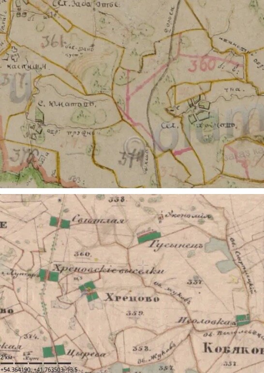 На ПГМ( план генерального межевания) 1790 года видим село Хренова. На карте Менде 1862 г , видим появились Хреновские Выселки, которые сейчас называются Малое Хреново. А само старинное село Хреново исчезло.