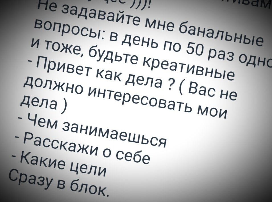 Обычно общение на СЗ начинается с лёгкого "привет". Ну а дальше, получив подобное сообщение, оппонент первым делом лезет на страничку и считывает всю доступную информацию о написавшем. Именно так делаю и я, и наверное большинство посетителей этого ресурса - прежде чем что-то ответить - просмотреть профиль, и согласно полученной информации уже написать что-то в ответ. Ну или не написать... Но в обратную сторону, кстати, слово "привет" не работает. Об этом упоминается в сотнях анкет наших прекрасных дам. Какая прелесть... Самооценку вот-вот разорвёт от переполнения! Тут простое привет не прокатит. Как минимум надо для начала скрин банковского счёта предоставить. Никаких прелюдий! Сразу по делу! И тут видимо нужно скрин для начала прислать. Ну это если вы разводимый кролик, конечно... Но лично в мою сторону, большинство сообщений начинается именно со слова "привет". Но я и не против, ничего плохого я в этом не вижу. Нормальное начало общения, и ничего более. Лично мне приятно. Да и ни к