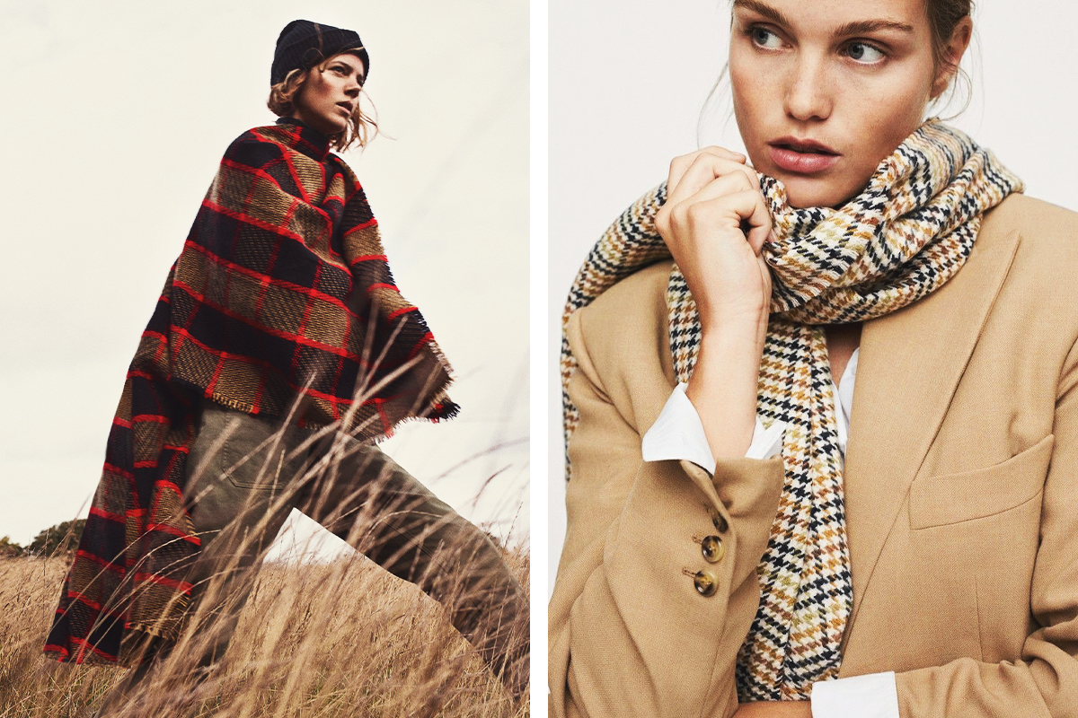 • Самый трендовый дизайн в этом году — палантин в английскую клетку. В стильных подборках чаще фигурирует ярко-красный вариант, но если хочешь чего-то более универсального и сдержанного, присмотрись к бежевой клетке или пыльно-зеленой «шотландке».