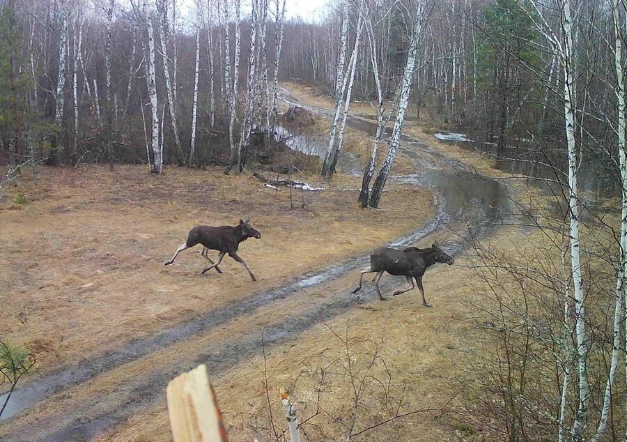 Охотоведы запечатлели на камеру бегущих лосей в Железногорском районе Курской области. Как пояснили в «Курскохотрыбцентре», снимок был сделан при обследовании общедоступных охотничьих угодий на территории Железногорского района. В кадр попала пара сохатых, перебегающих грунтовую дорогу в лесу. Курские охотоведы периодически делятся интересными фактами из жизни животных. Так, например, ранее они рассказывали, что лоси — токсикоманы. Они обожают запах бензина, солярки, ацетона и прочих химических соединений. «Нередко сохатых можно встретить пьяными, особенно в сезон сбора урожая. Люди выбрасывают в леса избыток яблок и прочие забродившие фрукты, а лоси вовсе не прочь подкрепиться ими. А так как животные не приучены к алкоголю, то это действует «сногсшибательно», — сообщали охотоведы. Впрочем, весной животным поневоле приходится быть трезвенниками, сейчас их рацион ограничен древесным кормом: пока не появилась зелень, лоси едят ветки, хвою и кору. Антон ФИЛИППОВ, фото «Курскохотрыбцентра»