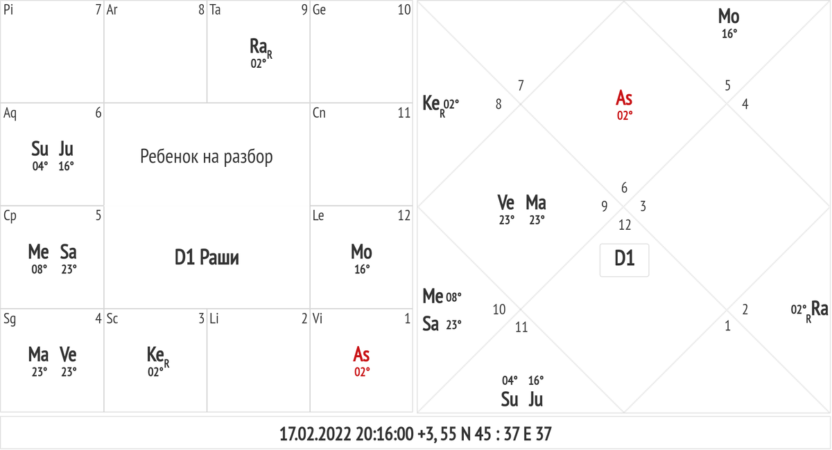 Немного о ректификации. Самый точный способ определить время рождения, на мой взгляд, это метод Саптамши. Правда, есть тут одно обязательное условие. Необходимо иметь хотя бы одного ребëнка :) Разберëм алгоритм на примере. Прежде всего смотрим Раси сына/дочери. Нужно определить ключевые характеристики, которые мы будем соотносить с Саптамшей родителя. Перед нами Восходящая Дева с выраженными качествами Козерога. Лагнеш связан с сильным Сатурном. Далее строим карту родителя. В данном случае отца. Время его рождения известно приблизительно. Обратите внимание на Навамшу с лагной в Деве. Строим D7. Для указанного времени рождения Саптамша не соответствует характеристикам ребëнка. Чётная лагна предполагает, что первенец будет обладать качествами Рыб (читаем по 9 дому). Нам же нужен Козерог. Меняем лагну на Тельца. Теперь позиции встали на свои места. Хозяин дома ребëнка, Сатурн, расположен на оси Лев/Водолей, которая чëтко выражена в карте сына. Таким образом точное время рождения отца