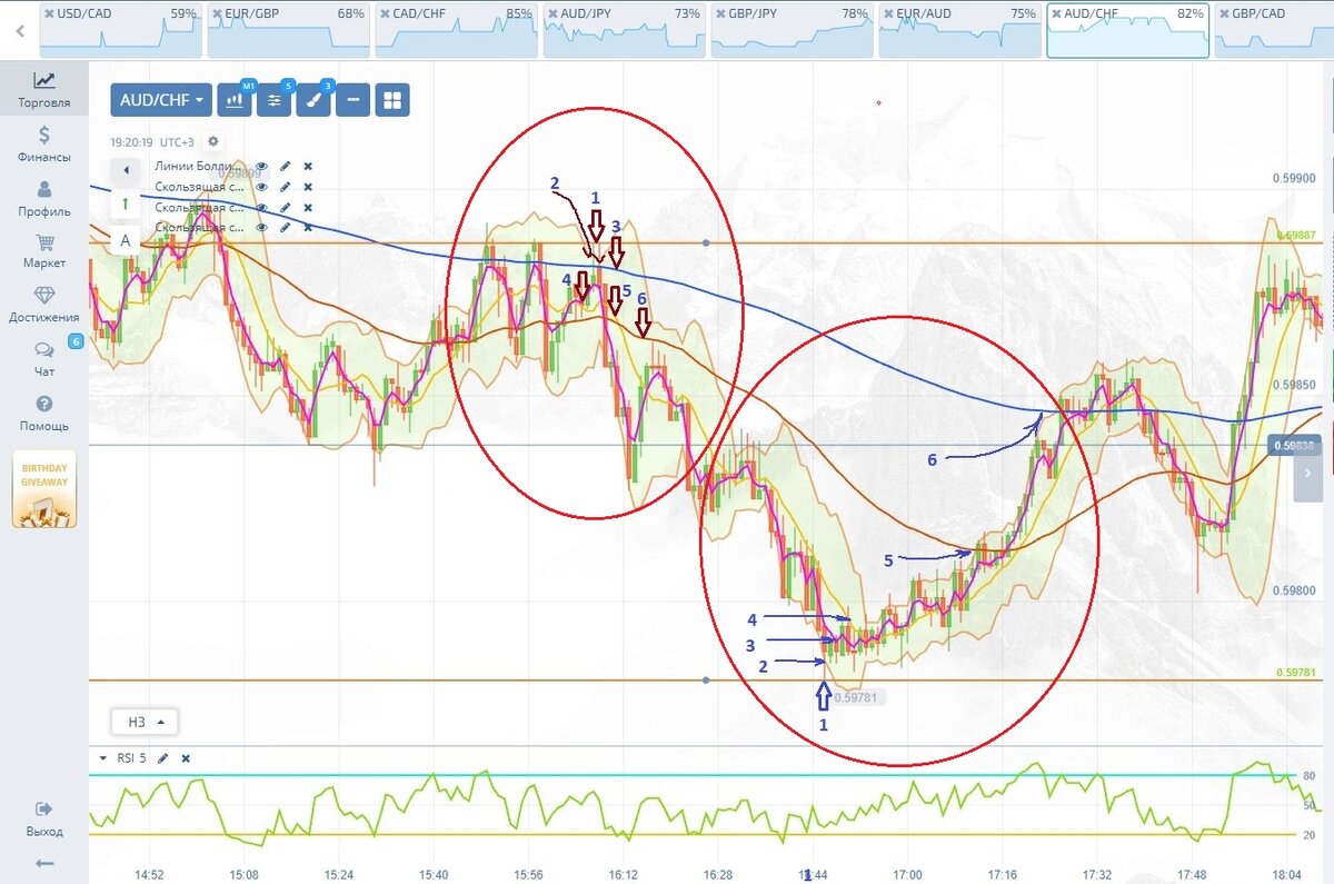 Ниже схематично постараюсь представить движение цены на графике. На скриншоте представлено движение цены сверху вниз и далее - снизу вверх. Как вы поняли, нумерация означает направление движения цены.