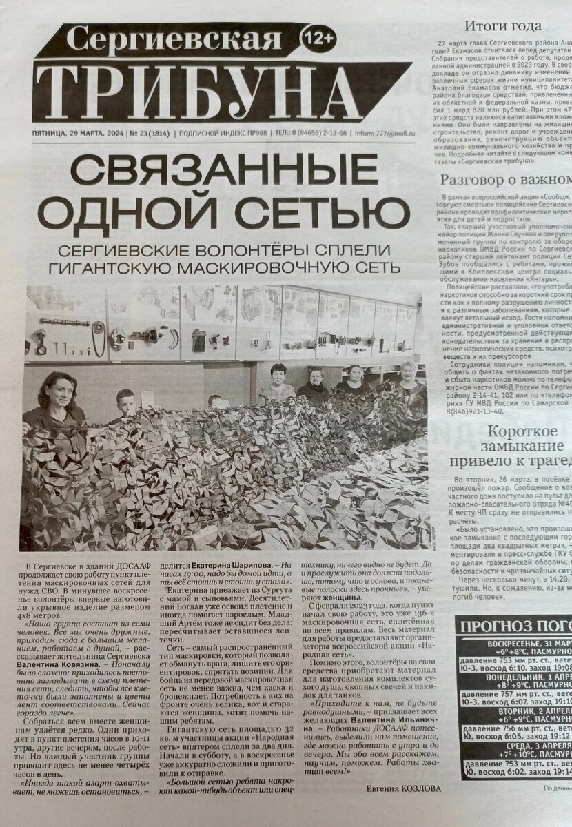 В газете «Сергиевская Трибуна» вышла публикация о том, как в Сергиевском СТК РО ДОСААФ России Самарской области волонтеры и активисты ДОСААФ плетут маскировочные сети для нужд участников СВО. На сегодняшний день сплетена 136-ая сеть.