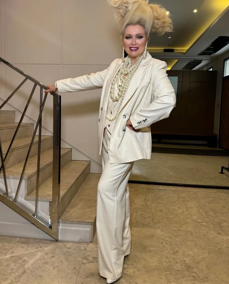 Мне интересно - куда в таком виде можно пойти? Варианты огорода с целью возврата воронами прошлогоднего урожая отметаю сразу как несостоятельный - костюм слишком маркий. В таком на огородах не стоят! Прелестная, конечно, прическа, очень живенько, непринужденно и естественно, но весна все-таки. А если мимо будет пролетать какой-нибудь грач и ему захочется поправить жилищные условия? Или проснется рой пчел, а Лена, на свою беду и им на радость, будет проходить мимо? Они же там поселятся и скажут, что так и было...Мне кажется, неприятно, когда у тебя все время жужжит в ухе Хоть кто знает эту богему, что им нравится, а что нет.... А еще Лену с учетом такого количества блестящей бижутерии запросто могут унести в гнездо сороки. Уволоку и не спросят, как звали. Вытаскивай ее потом оттуда.... А вот костюмчик ничего - если смотреть отдельно от прически и от украшений. И покрой хороший, и цвет приятный, и сидит удачно. А еще мне понравился пиджак Танюшки Брухуновой. Я не знала, что у нее выросла