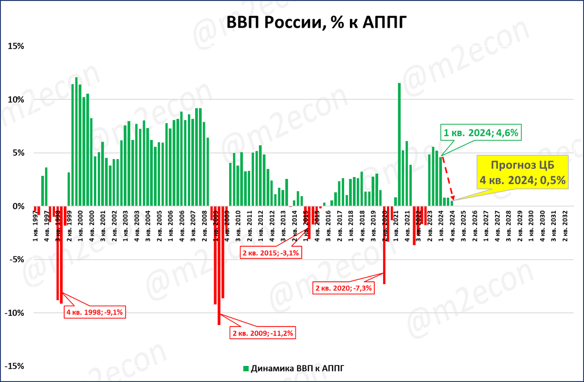Что новые данные Росстата и Минэка за февраль говорят о прогнозе ЦБ? По этому прогнозу рост ВВП во 2-4 кварталах 2024 года должен обнулиться. Если ВВП вырастет на 4,6% в 1 квартале Когда Минэк дал свою оценку роста ВВП в январе (+4,6% годовых), мы посчитали: что, если в феврале и марте (= и в первом квартале в целом) темпы роста сохранятся на том же уровне +4,6% годовых? Получилась такая картина. Рост в 4 квартале по прогнозу ЦБ должен составить 0,5%*. А рост за год должен составить 1,5%**. Легко посчитать, что при таких заданных условиях рост ВВП во 2 и 3 кварталах должен составить менее 1%, а именно 0,8% годовых. Когда мы об этом писали (см. "Как рушатся пессимистичные прогнозы ЦБ"), мы предупреждали: Первые оценки МЭР традиционно пересматриваются в сторону повышения (=за январь после пересмотра будет не 4,6%, а больше). В феврале рост будет больше обычного на 3,5% из-за високосного 29 дня (= в феврале рост будет не 4,6%, а выше). Так и произошло. Минэк оценил рост ВВП в февр