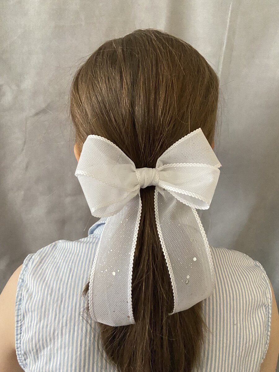 Белый бант на зажиме от бренда Mamberika - невероятно легкий, нежный, практически невесомый, при этом не мнется и прекрасно держит форму. Забудьте про заколку автомат, которая может расстегнуться в самый неподходящий момент. Создайте нужную вам прическу, а в конце красиво украсьте её бантом из декоративной ленты с глиттером. Собрала 3 классных способа использования банта на зажиме в прическах. 1. Собираем волосы в хвост при помощи крепкой резиночки, а сверху на нее бант. Зажим отлично фиксируется, а под ним легко прячется резиночка. Прекрасный вариант для школы. 2. Прическа "Мальвинка". Собираем пряди у висков, закрепляем их на затылке резинкой, а поверх нее шикарный бант. Волосы вроде и распущены, красиво ниспадают, но при этом позволяют удобно заниматься своими повседневными делами, да и на выход с такой прической не стыдно. 3. Пучок. Волосы собираем наверх в хвост Можно дополнительно продеть их в бублик. Фиксируем оборачивая вокруг бублика, либо формируем узел просто вокруг