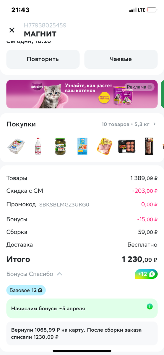 Или как меня одурачили в Магните… Этот месяц я запланировала немного по другому. Сыну пришлось увеличить карманные расходы, мальчик растет. Но общий бюджет оставила тот же 40 тысяч на двоих. Впереди выходные, кушать будем много и хотелось бы вкусно))) Именно это положение вещей и заставило меня сегодня промониторить все возможные скидки и бонусы на продукты. Просмотрев все предложения остановила свой выбор на скидке в 35% на первую закупку в Магните через Сбермаркет от 1500. В принципе предложение подходящее, составила в голове меню на выходные, закупка оплачена, ждем доставку! Нооооо!!! За полчаса до назначенного часа, мне возвращаются деньги на карту и списывается сумма больше на 180 рублей. Я удивилась и решила разобраться, что не так с моим заказом. Каково же было удивление, что из заказа был удален чай суммой на 400 рублей. И соотвественно мне не положена скидка в 35%!!! Я не первый раз заказываю доставку продуктов, но с таким сталкиваюсь впервые. В Пятерочке мне звонили и спро