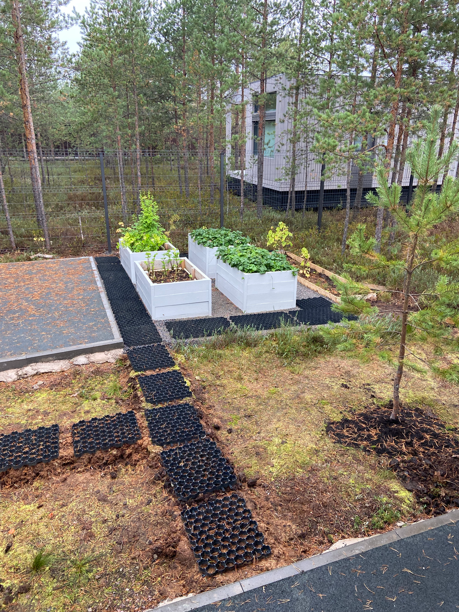 Помните, как я писала о технологии устройства дорожек вокруг высоких грядок? Кому интересно, прочитайте вот здесь. А в данной статье расскажу о том, как эти дорожки пережили зиму. Вот как это выглядело осенью. Напомню, каким был этот "дорожный пирог": нижний слой - геотекстиль (у нас болотистая почва), потом слой песка, а на него - мелкий гранитный отсев серого цвета. На все дорожки, в том числе вокруг высоких грядок, мы положили пластиковые георешётки. На верхнем фото пока не видно, что весь периметр ими закрыт, а вот на нижнем вроде бы просматривается. К слову сказать, высокие грядки были реально тёплыми, потому что вокруг них снег всегда подтаивал. А в начале зимы, когда снегопады только начинались, высокие грядки занесло в последнюю очередь. Как только потеплело и снег стал таять, пришла пора освободить от снежного плена и наши грядки - я боялась, что когда снег начнёт таять более интенсивно, нижние доски окажутся в воде. В один из хороших солнечных дней я взяла лопату и пошла