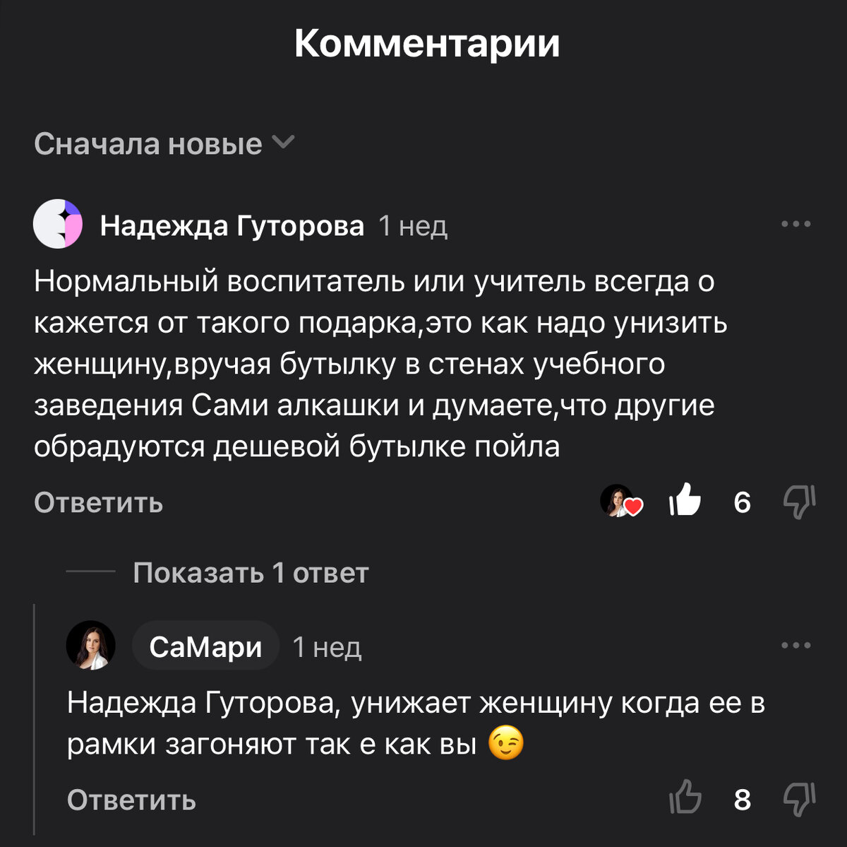 Накидаем г-на на вентилятор? Я тут подумала… На этом скрине не видно, но так как статью Дзен хорошо крутит, именно эти комментарии собирают в день кучу лайков и дизлайков. В сухом остатке: 6 и 8, но поверьте, их там значительно больше, учитывая, что статью прочитали 3,1к человек, а показал ее Дзен 21к раз за 28 дней. Самое забавное, что в полемику никто не вступил, только пальцы вверх и вниз. Но как часто! Если полистать комменты, то в ответ на вопрос из нынешнего заголовка сами педагоги высказались положительно. У меня этот вопрос нравственной проблемы не вызывает. Собственно так же, как и вопрос об аналогичном подарке врачам, хотя эта профессия триггерит людей куда меньше. А еще я могу подарить алкоголь полицейским и они мне тоже. И военным… И, о боги, друг другу все они тоже дарят алкоголь 😱 Получается, что мир, в котором живет Надежда(я и мы все), полон алкоголиков, унижающих друг друга бонусными бутылками в стенах садов, школ, вузов, больниц, судов и других ведомственных