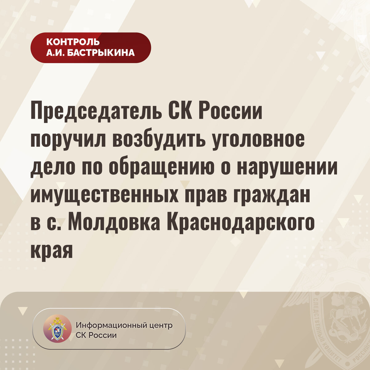 Председатель СК России поручил возбудить уголовное дело по обращению о нарушении имущественных прав граждан в с. Молдовка Краснодарского края