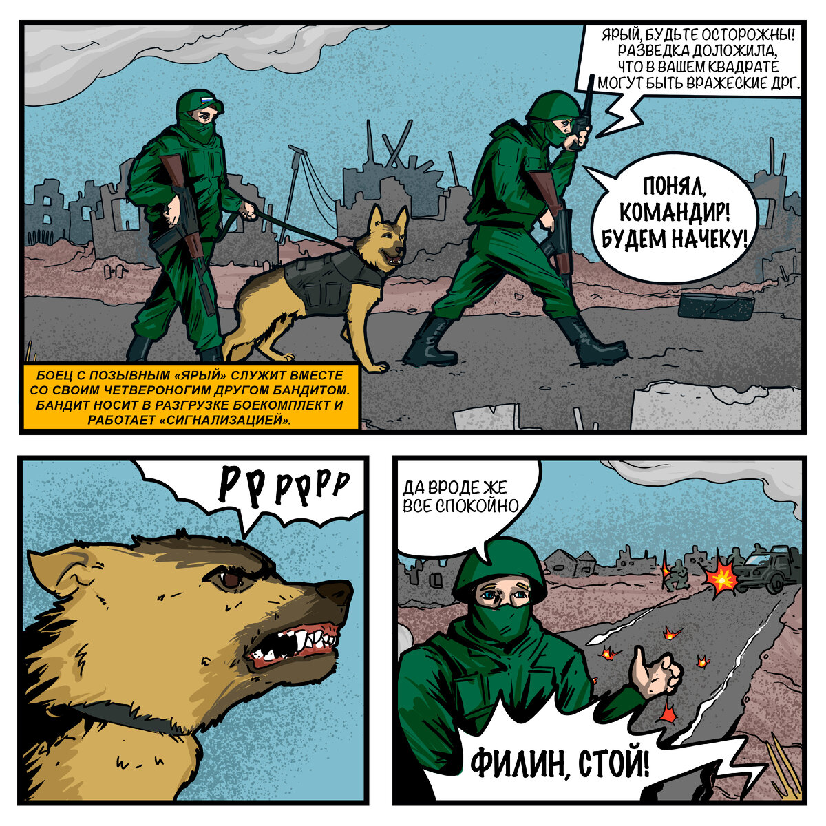 Боец с позывным «Ярый» служит вместе со своим четвероногим другом Бандитом. Бандит носит в разгрузке боекомплект и работает «сигнализацией», в среднем около 13-25 кг с боекомплектом: восемь магазинов, четыре гранаты.