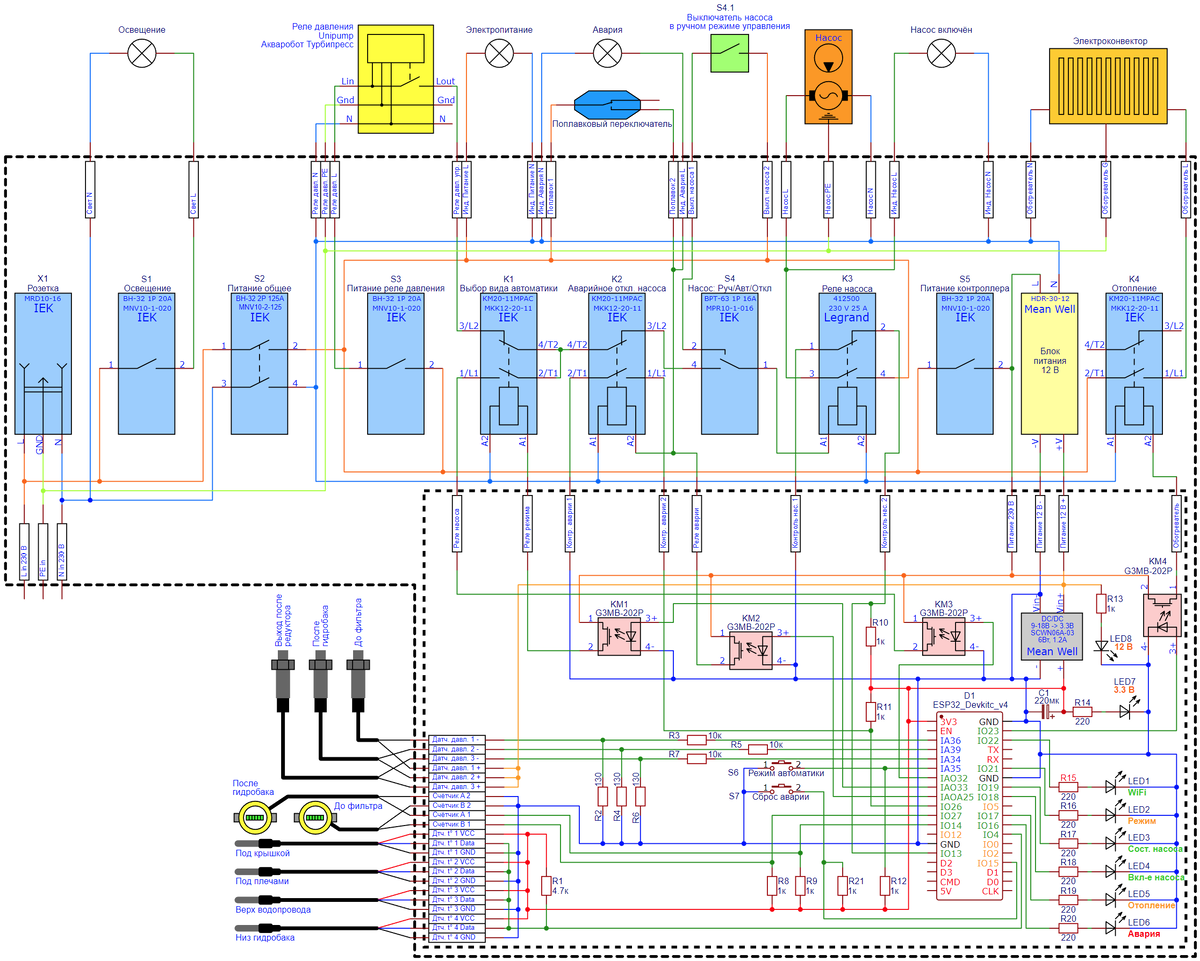 Контактором К2 управляют одновременно два источника - самодельный контроллер и поплавковый выключатель ("лягушка"). Контроллер может сгенерировать сигнал аварии по множеству причин, заложенных в алгоритм его прошивки. Поплавковый включатель независимо от контроллера следит за затоплением кессона и отключает насос в случае повышения уровня воды в нём, даже если контроллер неисправен.