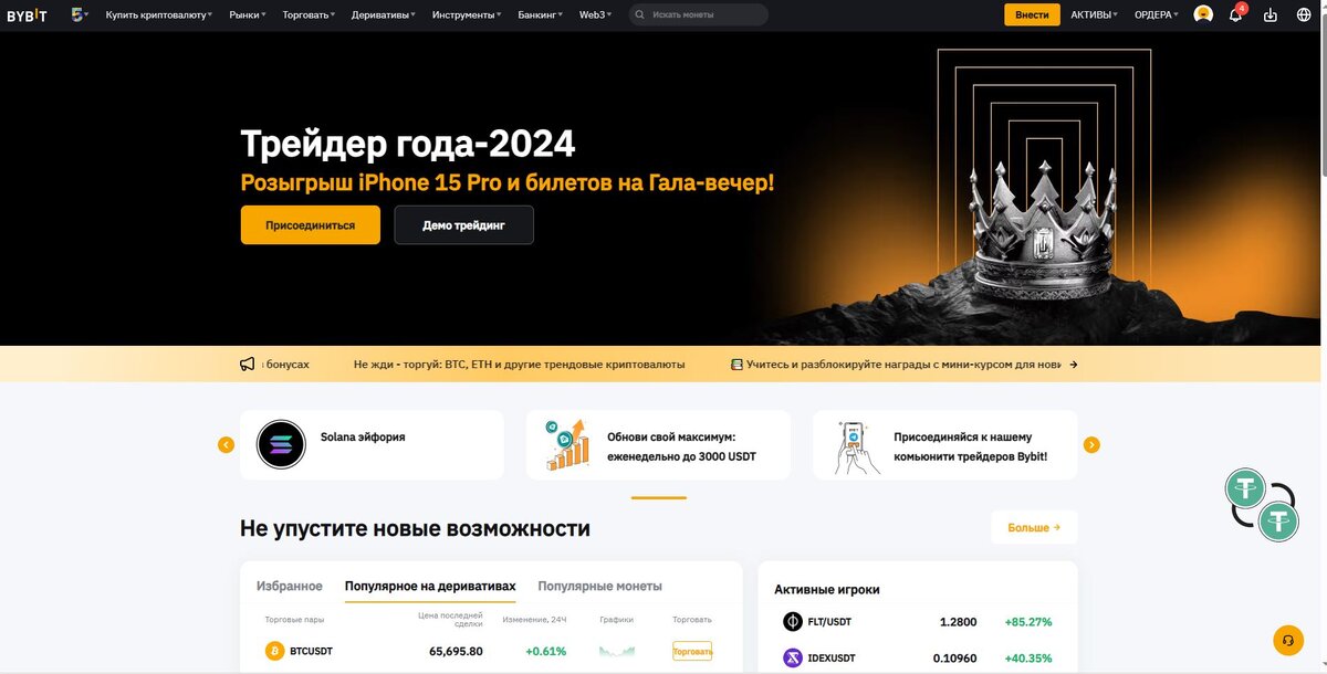 Bybit – это биржа которая открылась в марте 2018 года, она предлагает пользователям большой спектр услуг такие как: P2P, Спотовая торговля, Фьючерсная торговля, Стейкинг так-же на данной бирже проводятся Launchpad и совсем недавно они открыли свой NFT маркет. Биржа Bybit входит в топ-20 бирж по объёму спотовой торговли, и топ-3 по деривативам. По объёму становится понятно что данная биржа ориентирована на Фьючерсную торговлю. Регистрация на Bybit для России в 2024 году