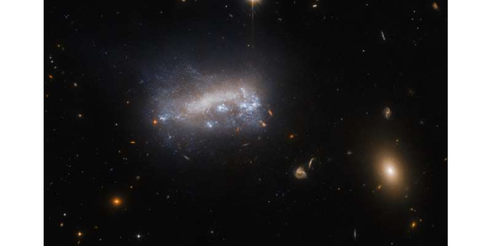 Космический телескоп НАСА «Хаббл» сделал захватывающий снимок LEDA 42160. Это галактика в созвездии Девы, находящаяся на расстоянии около 52 миллионов световых лет от нас. Давление межгалактического газа оказывает необычайное воздействие на эту карликовую галактику, порождая звезды в атмосфере скопления Девы.