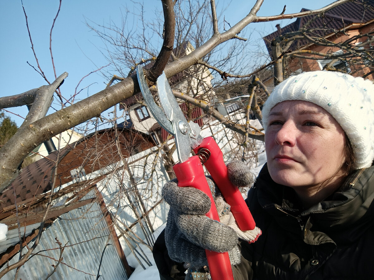 Я не люблю приезжать на дачу зимой. На улице холодно, сыро, снежно - ничего ж не сделать. Так и в этот раз, приехали мы на каникулы, окинули взором полутораметровые сугробы - тоска. Даже читателям пожаловалась - делать, мол, на дачах в Подмосковье пока нечего. Наивная! 🤣 Работы в итоге набралось столько, что за полторы недели со всем и не управилась. По высоченным сугробам, как выяснилось, очень удобно обрезать деревья. Стремянку в снег воткнул - и полез. Тем более в прошлом году в апреле мы с обрезкой опоздали, почки уже набухли во всю. Сейчас успела покромсать то, до чего руки не дошли осенью. И даже спилили макушку огромной вишни - баобаб этот если и плодоносил иногда, то исключительно на верхних ветках для птиц. А нечего было выращивать такого монстра! Всегда говорю, что резать деревья нужно безжалостно и результат в виде урожая не заставит себя ждать. Да и ухаживать за такими намного проще. Только закончили с деревьями у бабушки и у папы - снег стал стремительно таять, показы
