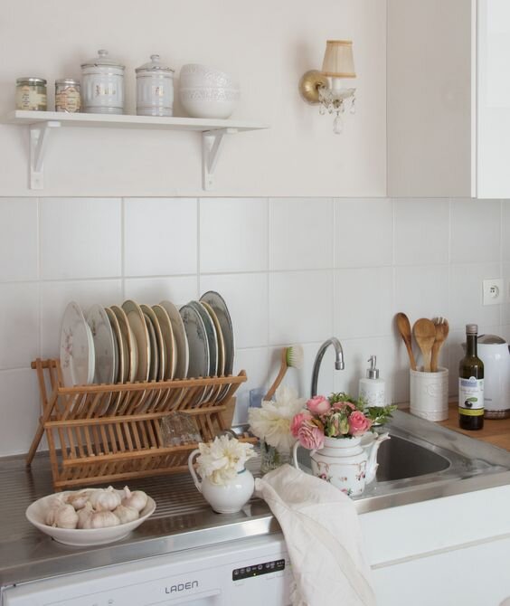 Установите рядом с мойкой встроенную сушилку для посуды или специальные крючки для хранения губок и моющих средств: