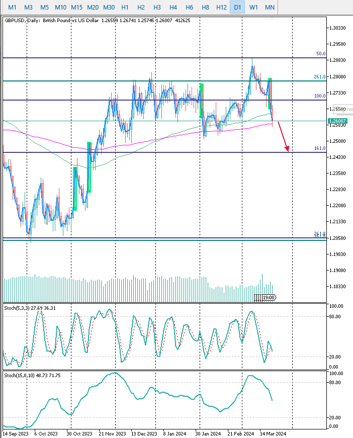 D1 Прогноз с прошлой недели отработал частично. Цена прошла наверх чуть дальше первой цели на уровне 261% по сплошной зеленой Фибо (~1.30800) и развернулась. В итоге я передержал позицию в ожидании прохода выше, но цена обновила недельный минимум, закрывшись по SL (тут тоже моя ошибка, что не передвинул его в безубыток). На новой неделе ожидаю продолжение нисходящего движения до уровня 161% по сплошной синей Фибо (~1.24500). Там же находится максимум важного восходящего бара (отмечен зеленым слева на графике). H4 По двум пунктирным розовым Фибо предполагаю зоны отката наверх перед продолжением нисходящего тренда. Ожидаю появление хвостов, направленных вверх и пиков на Стохастиках в район 80. Дополнительным сигналом может быть касание МА. H1 Оставлю просто картинку для иллюстрации. Важные новости по GBP и USD ожидаются 28 марта, в четверг. Возможно в этот день будет основное движение.