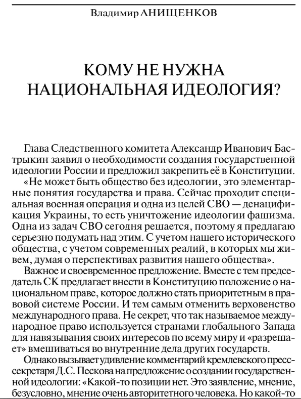 Кому не нужна национальная идеология. Моя статья в журнале "Молодая гвардия" № 1-2 за 2024 год Глава Следственного комитета Александр Иванович Бастрыкин заявил о необходимости создания государственной идеологии России и предложил закрепить её в Конституции.