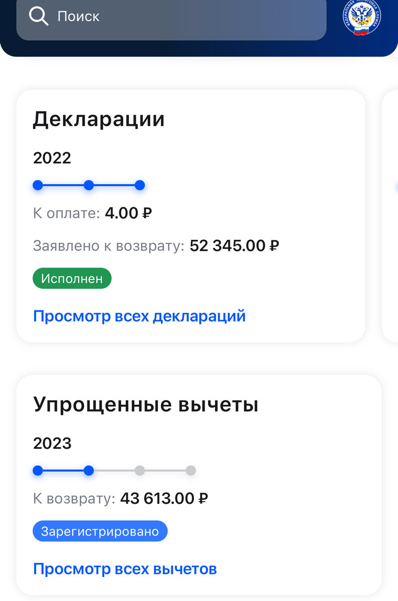 Приветствую 👋 всех! Сегодня про налоговый вычет. Как я писал ранее в своем заблокированном канале, в прошлом году я уже подавал документы на налоговый вычет. Процедура в прошлом году заняла почти около двух недель.🫨 Одним словом было не просто. Если в вкратце, то я подавал на возврат за ведение иис, лечение и покупку квартиры, а также на возврат денежных средств потраченных на материал для ремонта квартиры. Сумма заявленная к вычету -52345 рублей. Так вот. Сегодня я был очень удивлен процедурой подачи документов на вычет за 23 год. Я зашел в приложение налоговой и увидел возможность подать уже сформированную 💥за меня декларацию. Сумма заявленная к вычету -43613 рублей. Оформление заняло у меня 10 минут. Я нажал отправить и вуаля. Все. Дело в шляпе.) Удачи всем.🤝